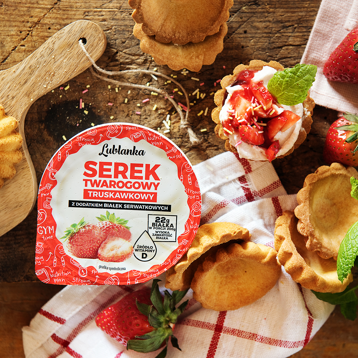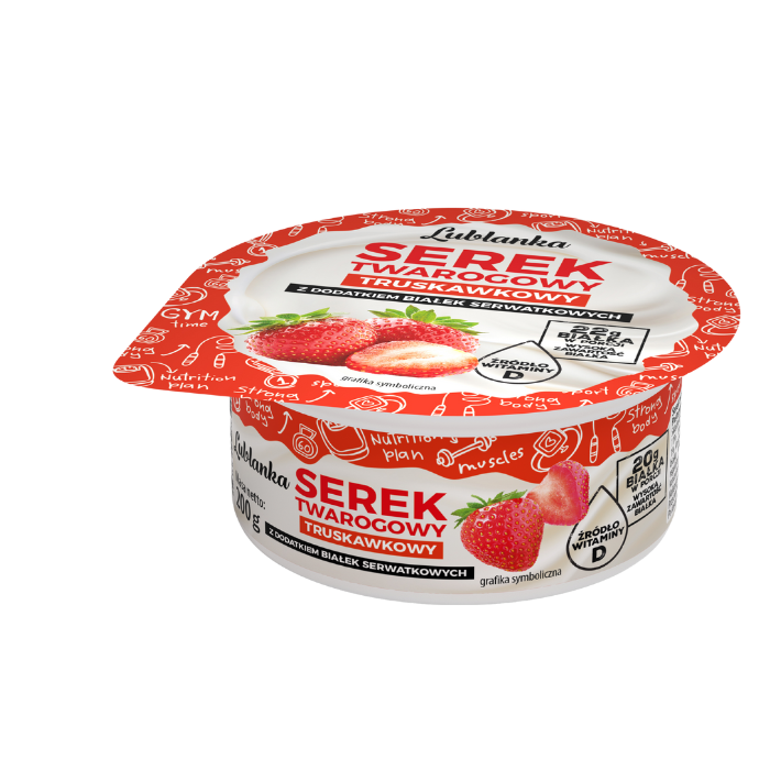 Skład: 45% twaróg półtłusty, śmietanka pasteryzowana, 11% truskawki, woda, cukier, skrobia modyfikowana, 1% koncentrat białek serwatkowych w proszku (z mleka), białka mleka, błonnik cytrusowy, aromat naturalny, regulatory kwasowości: kwas cytrynowy, cytrynian sodu; koncentrat czarnej marchwi, witamina D.